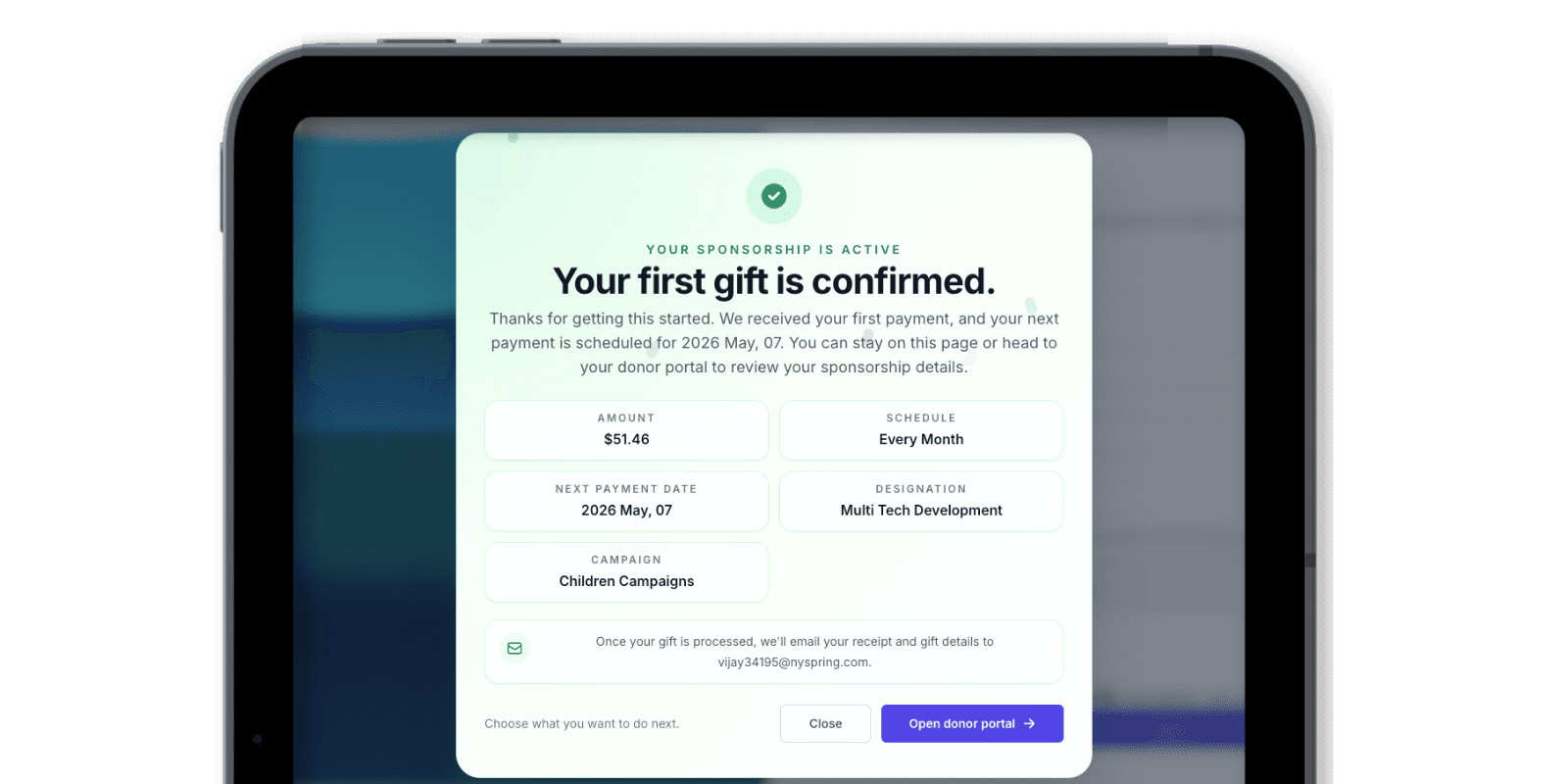Donors now see a clear confirmation message after completing a donation or scheduling a sponsorship, with options to continue exploring or return to your site.