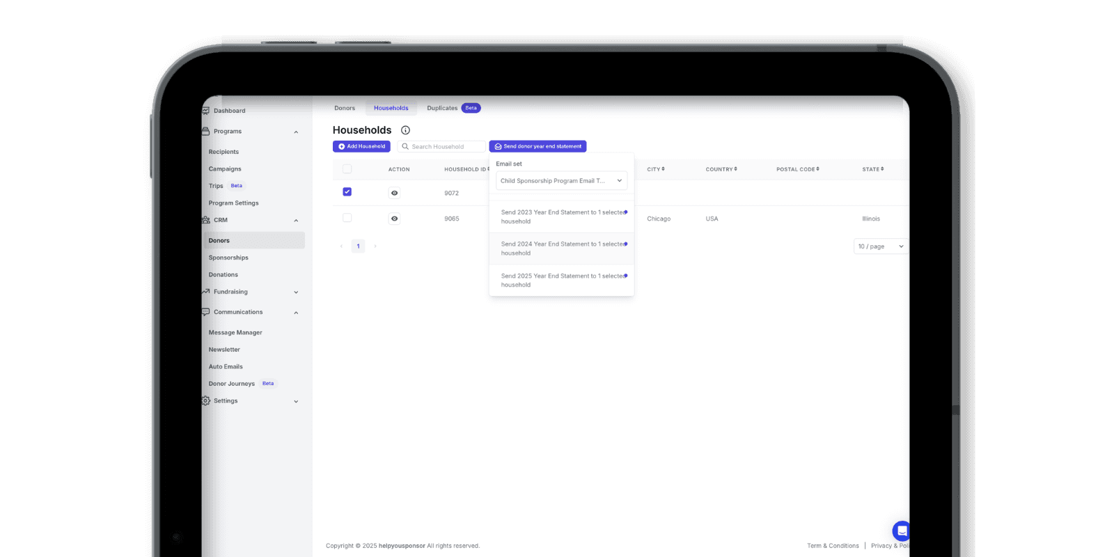 Send all the donations for every donor in a household for a given year to the household’s primary contact in a single email. No more chasing down individual donation records—everything is now in one place for easy tracking and communication.
