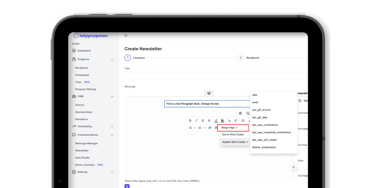 You can now add merge tags to your newsletters to insert donor-specific information automatically. Each message becomes more relevant, more personal, and more engaging—without extra work.